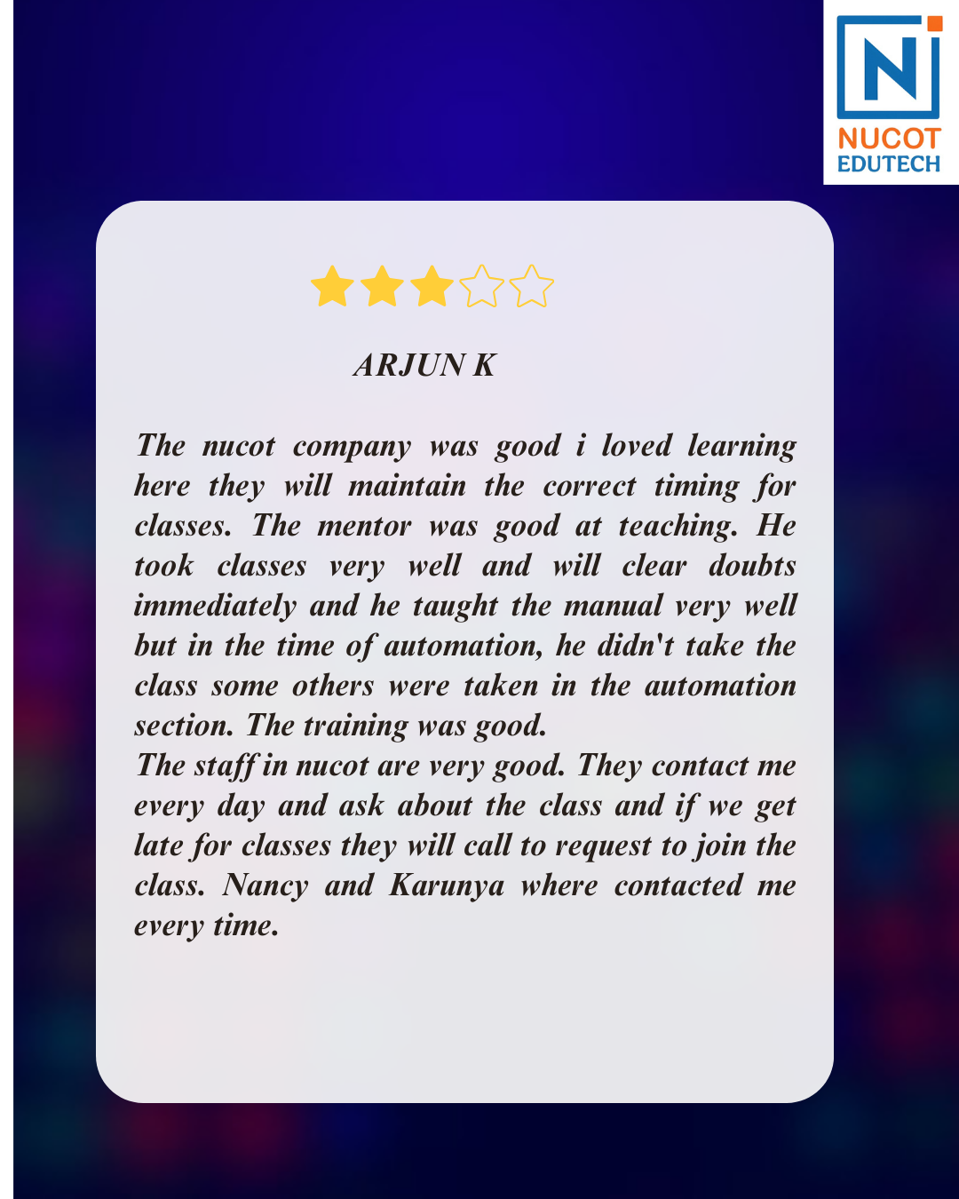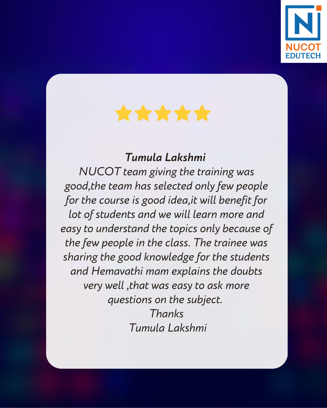NUCOT EDUTECH, a premier training institute in Bengaluru, is focused on bridging the gap between aspiring software professionals and the ever-evolving demands of the industry. With a broad spectrum of programs and 100% placement assistance, we provide students with the skills and expertise needed for career success. At NUCOT EDUTECH, dedication and hard work are recognized with abundant opportunities. We connect students with top IT companies and successful product-based businesses, delivering a high-quality education through practical, real-world learning experiences. Our experienced instructors, who have held leadership roles in the industry, are committed to addressing the skill gap and helping learners reach their full potential and achieve excellence.